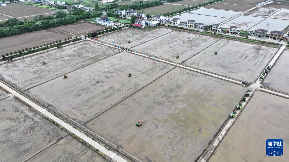 十数台の自動田植え機が4月23日、湖南省益陽市南県南洲鎮班嘴村の田んぼで作業した。これらの田植え機はルート設定やリアルタイムポジショニングなどの機能を有し、人は田植えをサポートするだけでよく、労働力を削減できると同時に、作業の規範化と効率化にもつながる。