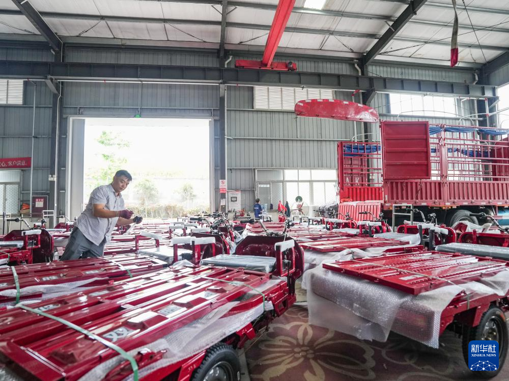 四川省眉山市天府新区の双勝新エネルギー車業有限責任公司の作業場の流れ作業ラインでは、作業員がアフリカや東南アジアに出荷する三輪車を組み立てている。
