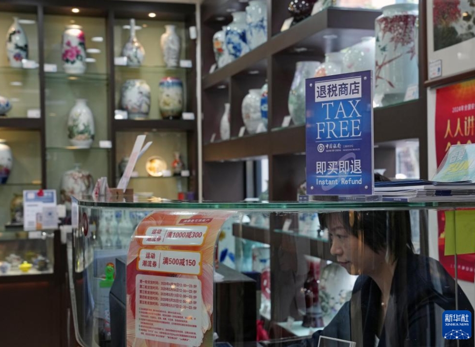 海市南京西路商圏にある景徳鎮芸術磁器店に置かれた税金還付サービスに関するプレート(4月29日撮影・劉穎)。