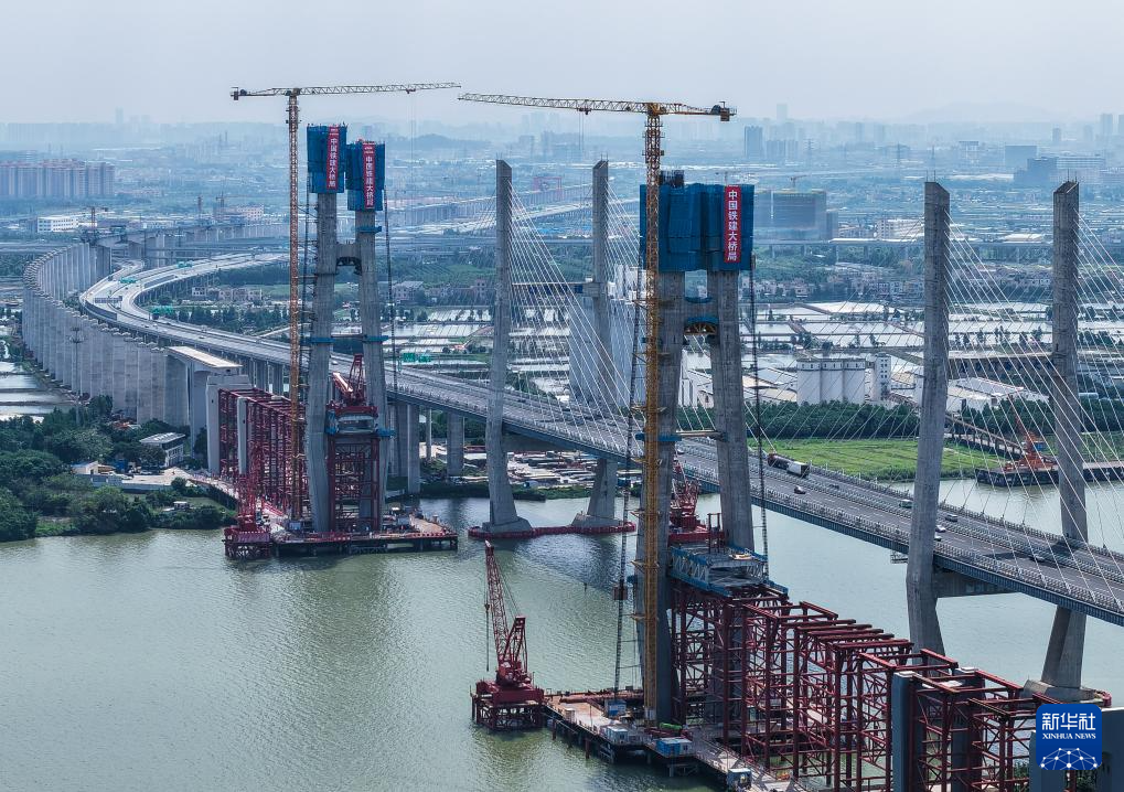 深江鉄道の磨刀門水道を跨ぐ主橋東主塔の上部が完成
