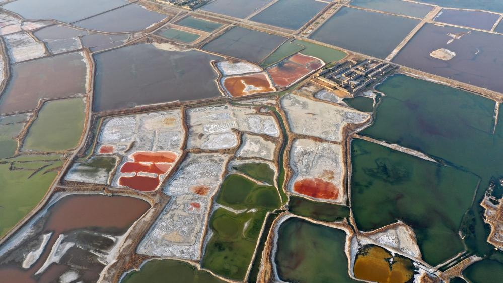 連日の気温上昇により、山西省南部に位置する運城塩湖では、色鮮やかな光景が広がっている。上空から見下ろすと、大地に散らばったパレットのような様相を呈している。