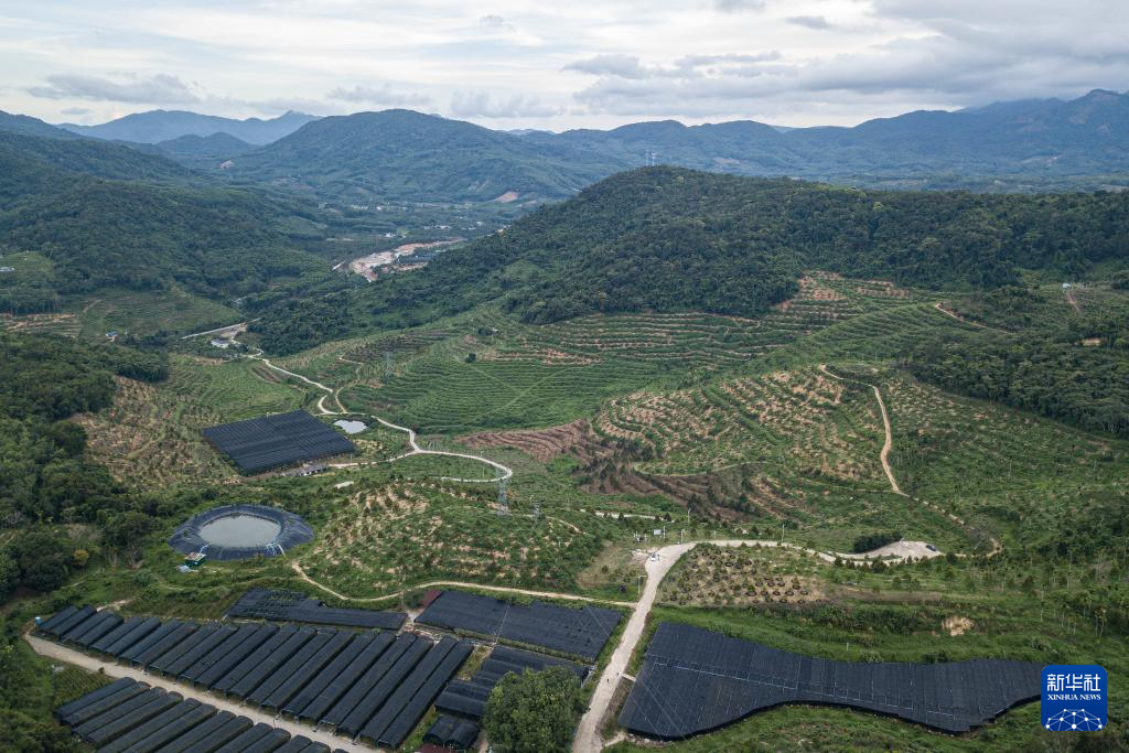 海南省保亭黎(リー)族苗(ミャオ)族自治県にある優旗潘坡ドリアン生態産業園は現在、約1000ムー(約66.7ヘクタール)のドリアンを栽培。(5月24日にドローンで撮影)