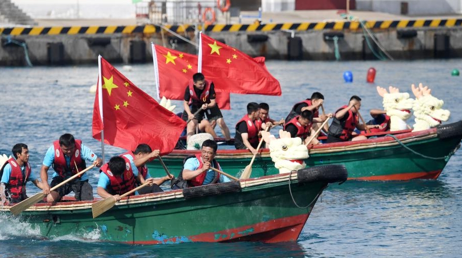 海南省三沙市は永興島で29日、ドラゴンボートレースイベントを開催。13チームが碧い海と青い空の下で激しく競い合った。
