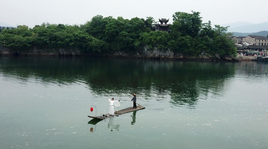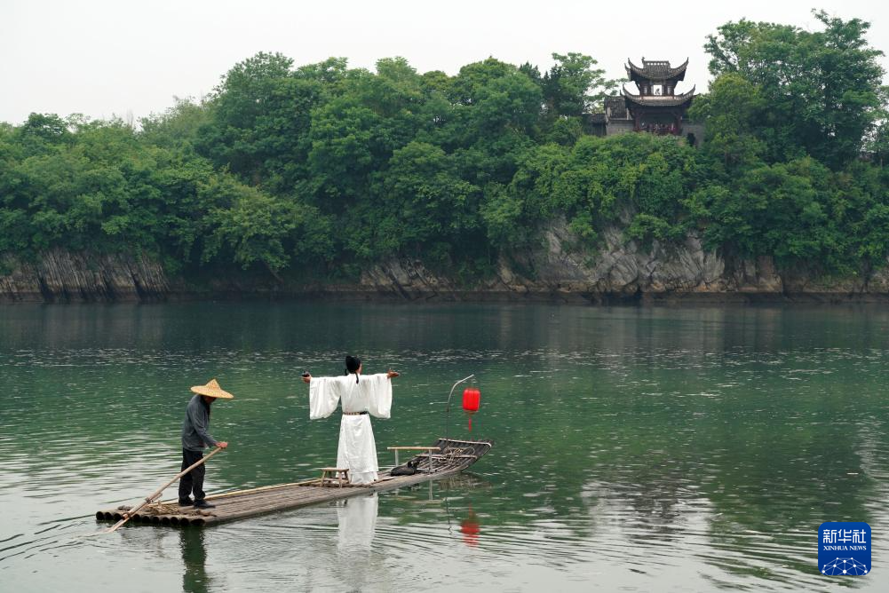 安徽宣城涇県の桃花潭観光地で、男性が李白役で筏遊びを楽しんでいた。新華社記者馬寧5月15日撮影