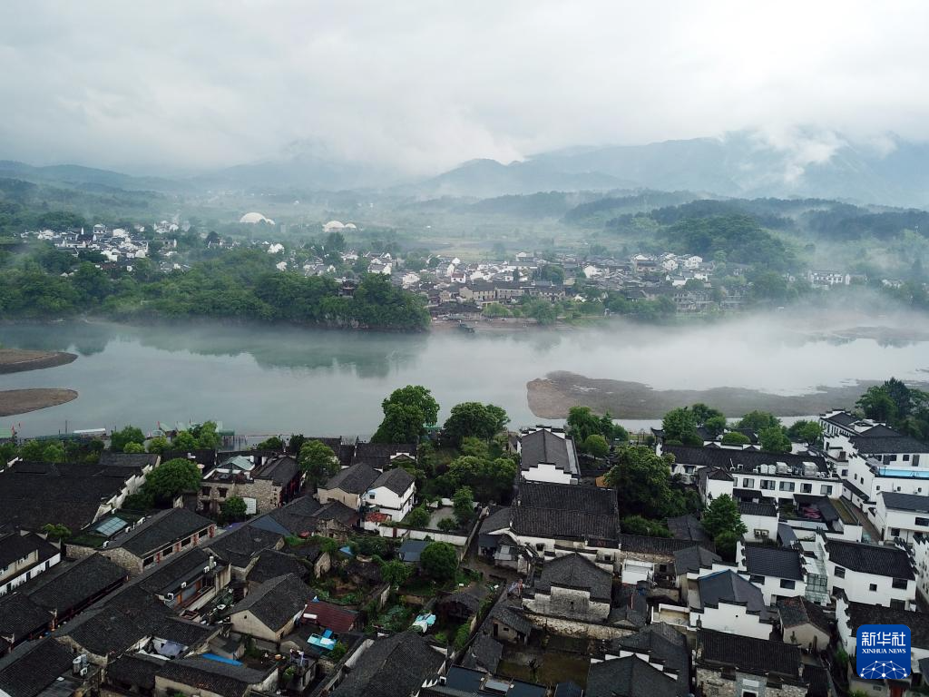 安徽宣城涇県、雨に煙る桃花潭の風景(ドローン写真)。新華社記者馬寧5月16日撮影