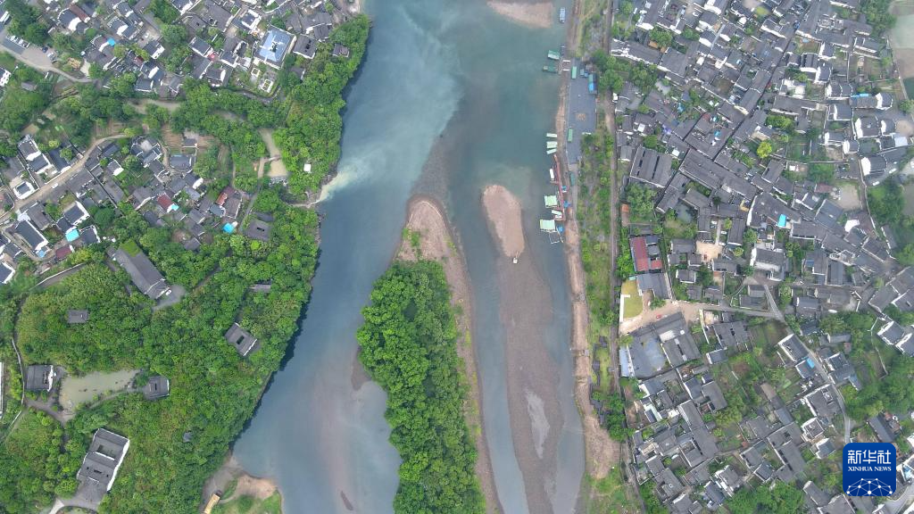 安徽宣城涇県、雨に煙る桃花潭の風景(ドローン写真)。新華社記者劉軍喜5月16日撮影