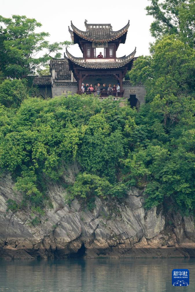 安徽宣城涇県の桃花潭観光地で、観光客が懐仙閣に登り絶景を楽しんでいた。新華社記者馬寧5月15日撮影