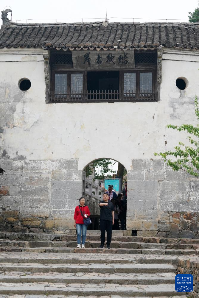 安徽宣城涇県の桃花潭観光地で、観光客が踏歌岸閣前で景色を眺める。新華社記者馬寧5月15日撮影