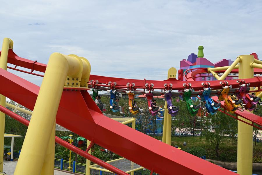 20日、一般客向けに開放された、世界初公開のアトラクション「ビッグレゴコースター」。(上海=新華社記者/陳愛平)