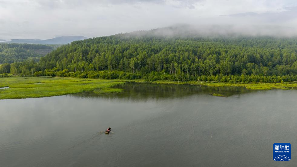真夏の朝、内蒙古自治区興安盟阿璽山市の烏蘇浪子湖が朝霧に覆われた。飛ぶ鳥が集い、美しい生態の絵を描き出した。