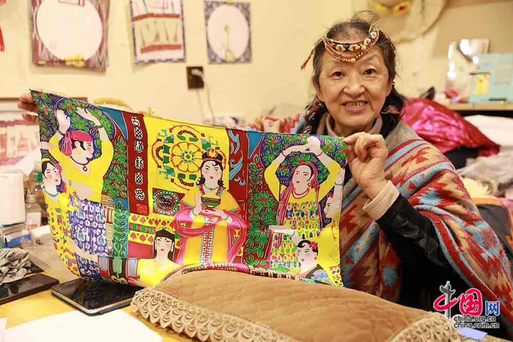 切り絵作品をプリントしたシルクスカーフを展示する王さん(中国網/趙娜撮影)