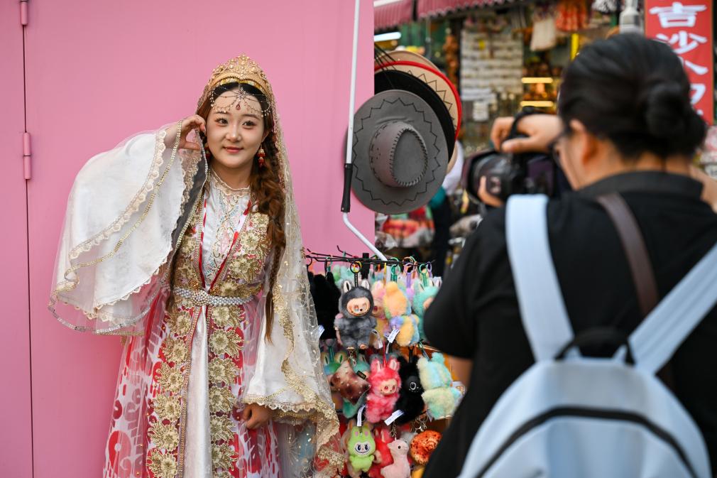 1日、新疆国際大バザールで記念撮影する観光客。(ウルムチ=新華社記者/丁磊)