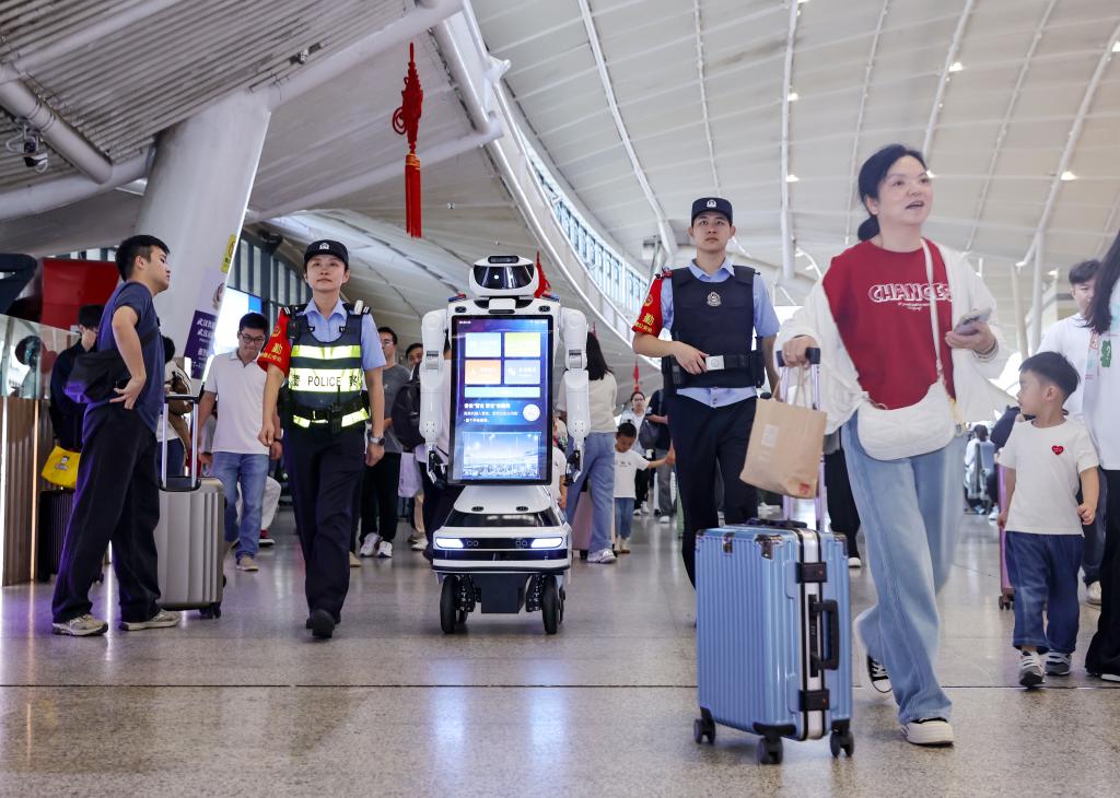 1日、湖北省の武漢駅で、構内をパトロールする武漢鉄道公安処武漢駅派出所の警察官。(北京=新華社配信/趙軍)