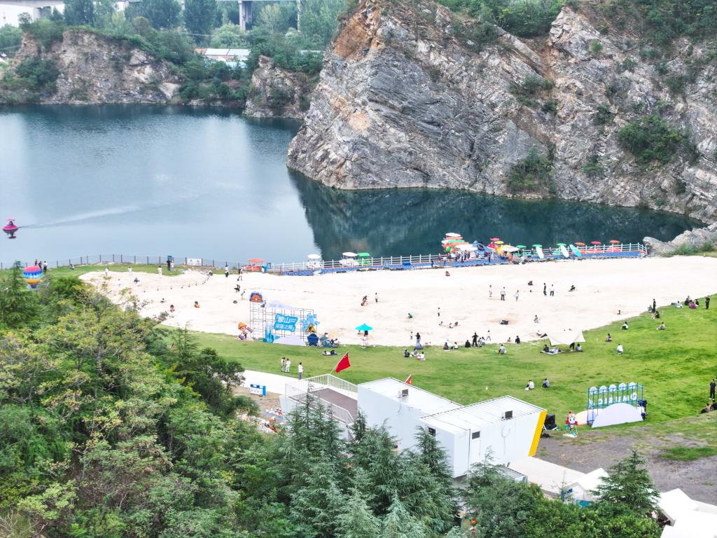 1日、淮安市盱眙県の象山公園を散策する観光客。(ドローンから、淮安=新華社記者/季春鵬)