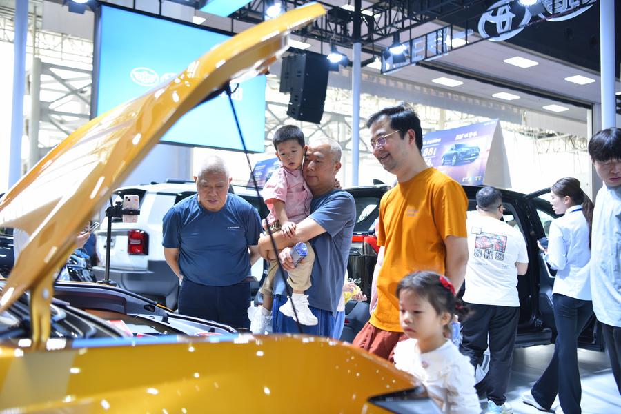 1日、湖南国際コンベンション・エキシビションセンターで展示された自動車を見学する来場者。(長沙=新華社記者/丁春雨)