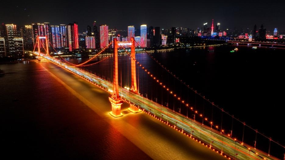 秋の夜の武漢で、長江大橋の照明と両岸の都会のネオンが交差し、流れ動く「江城」の夜景を描き出す。