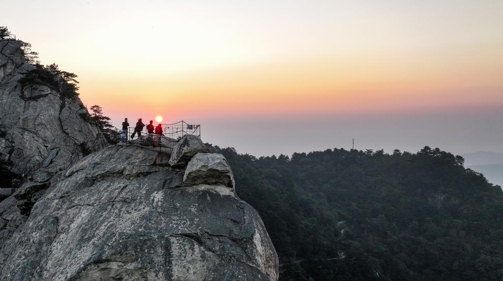 秋の日の朝、昇ったばかりの太陽が湖北省麻城市の亀峰山景勝地の峰と岩を照らし、「亀峰日の出」という壮大な景色を描き出す。