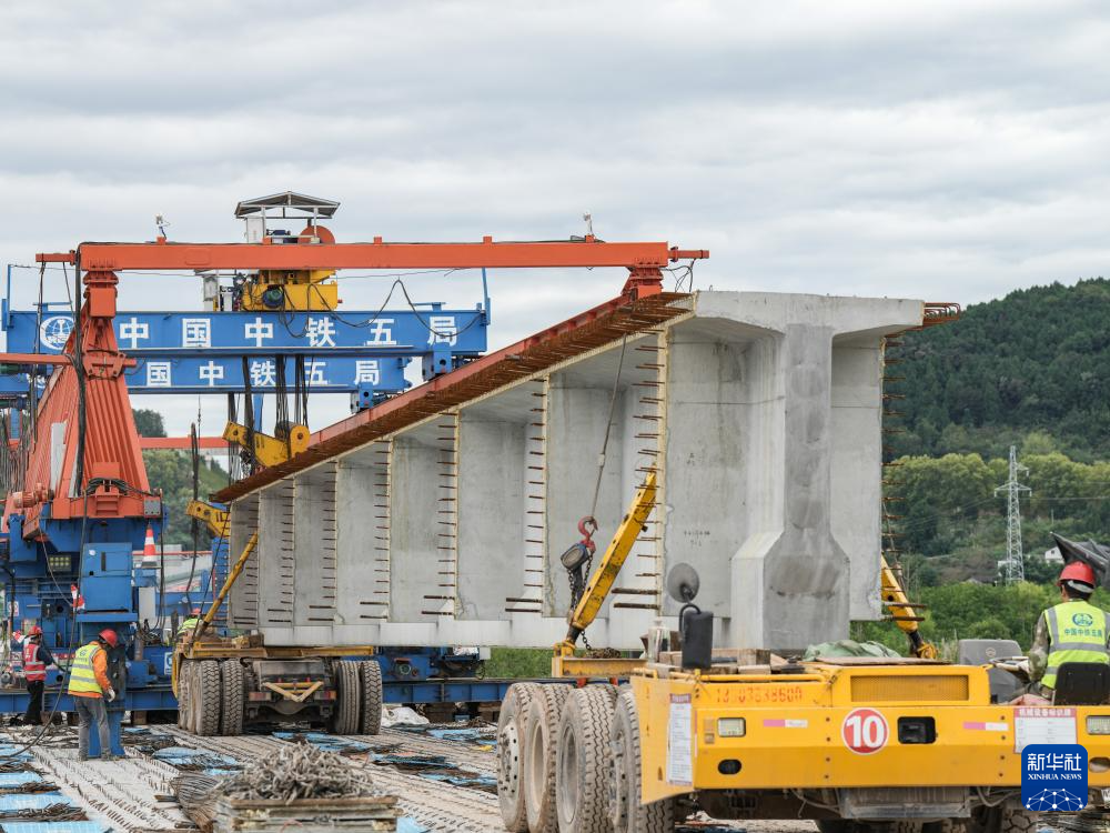 京昆高速道路の広元市と綿陽市を結ぶ区間の拡張工事の「牛頭河大橋」での架梁作業現場。新華社記者 王曦撮影