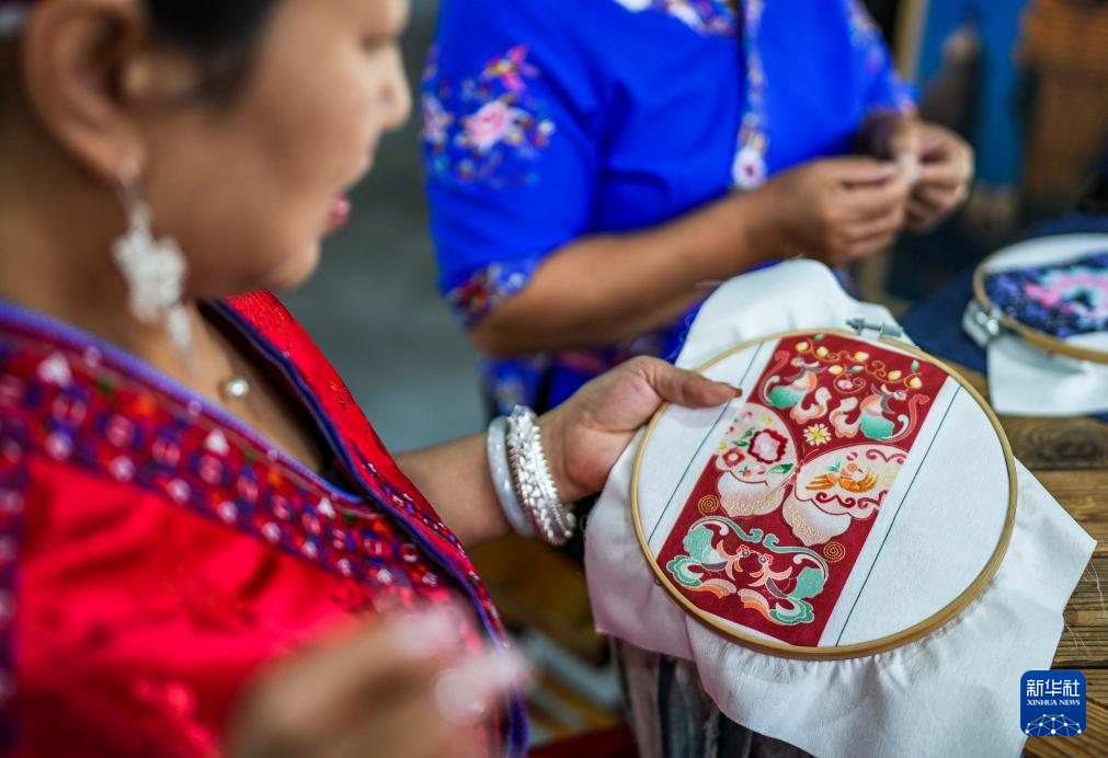 龍さんは近年、スマートな刺繍生産設備を導入し、苗族スタイルの刺繍製品を製作。壁布、掛け軸、衣類などに広く取り入れられている。女性たちは自らの手で自分なりの美しい世界を刺繍している。