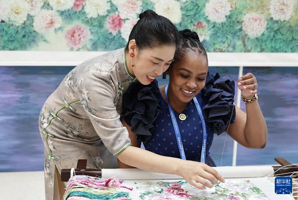 展示会で中国の刺繍を体験するボツワナからの賓客(10月14日撮影)