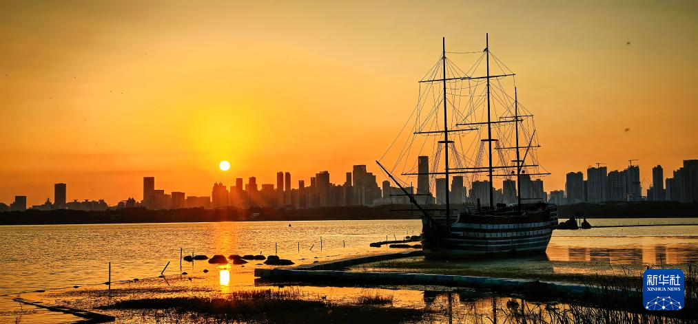 湖北省武漢市の東湖風景区が22日、夕陽と夕焼けに彩られ、壮麗な絵巻を広げた。(新華社記者・沈虹氷=撮影)