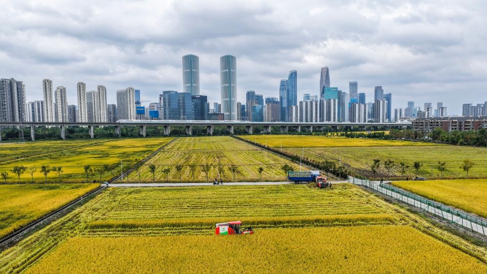 【新華社杭州10月22日】中国浙江省杭州市蕭山区で3千ムー(約200ヘクタール)余りに及ぶ水稲が収穫期を迎えた。黄金色の水田が、高速鉄道や遠くに立ち並ぶ高層ビルと重なり合い素晴らしい景観を見せている。