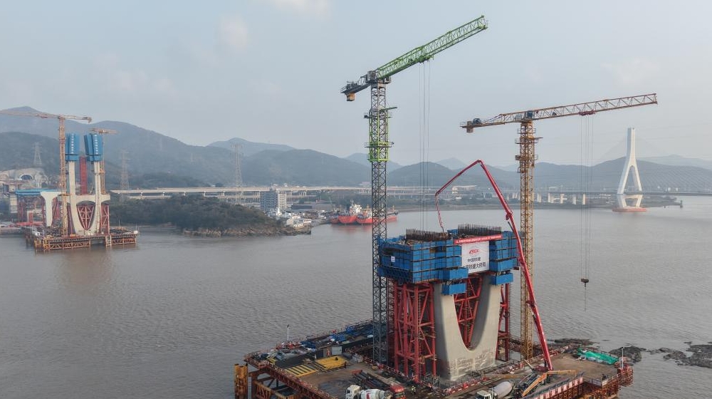 中国鉄建大橋局が建設する甬舟鉄道富翅門鉄道道路併用橋の20号メイン橋脚の下横梁のコンクリート打設が1日、順調に完了した。同橋は正式に中央塔柱の施工段階に移行した。富翅門鉄道道路併用橋は舟山本島と富翅島を接続する、甬舟鉄道の主要事業の一つだ。全長は約1726メートル、メインスパンは388メートルで、複線鉄道と片側3車線の高速道路が同層に配置される形式を採用。