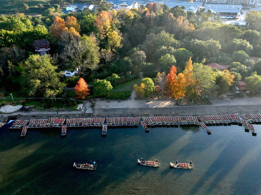 11月30日、福建省武夷山市を流れる九曲渓のいかだ乗り場。(ドローンから、武夷山=新華社記者/姜克紅)