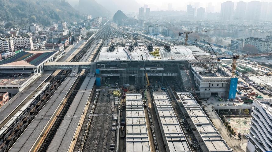 安順―六盤水高速鉄道六盤水駅駅舎及び構内改修工事が着実に進んでいる。中国鉄道電気化局集団が施工する駅舎鉄骨トラス構造物のリフトアップ工事が先ほど完了し、駅舎内部工事及び関連付帯設備の建設が進行中だ。