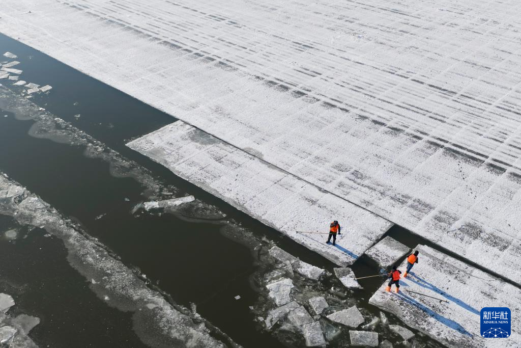 「氷の都」ハルビンで氷の切り出し作業が本格化。職人が松花江から切り出した高品質な氷塊は、氷雪大世界などの景観施設へ輸送される。