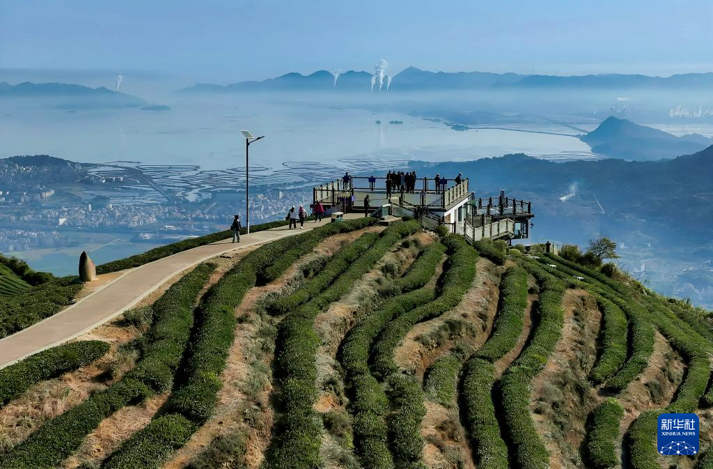 福州市連江県・炉峰山の展望台で山海の風景を楽しむ観光客(12月6日、ドローン撮影)