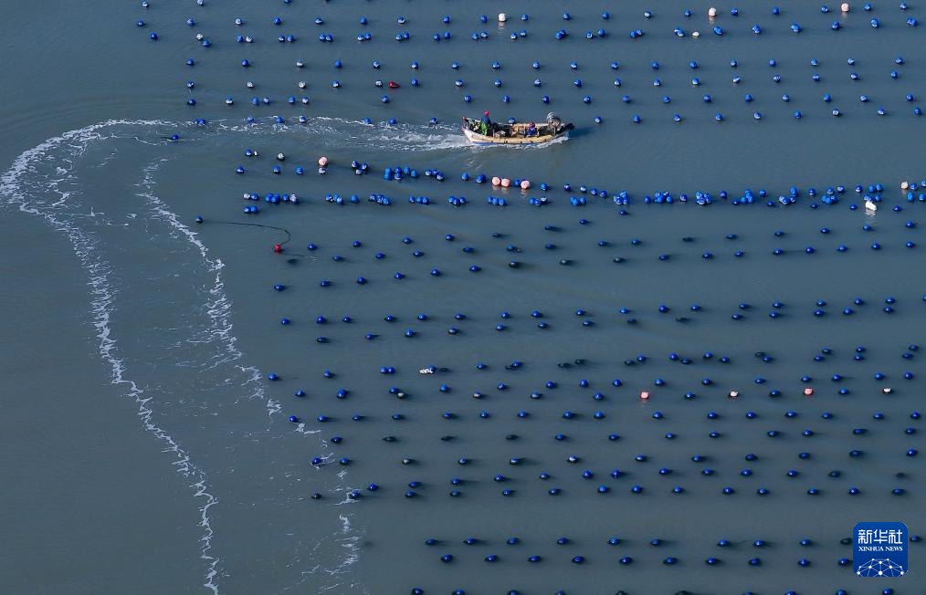 福建省連江県黄岐半島沖の養殖海域を航行する漁船(12月6日、ドローン撮影)