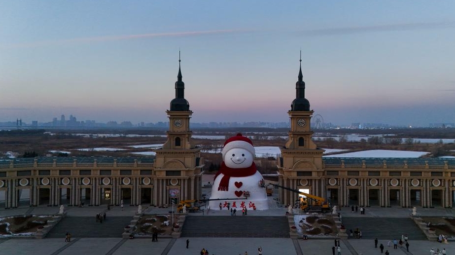 12月15日、中国黒竜江省ハルビン市の群力音楽公園で、巨大な雪だるまの本体工事が完了し、現在は最終的な仕上げ作業に入っている。