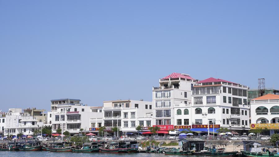 8日、排港村に続く潭門港の埠頭(ふとう)周辺に軒を連ねる海鮮レストラン。多くの観光客が食事に訪れる。(瓊海=新華社記者/許雨深)
