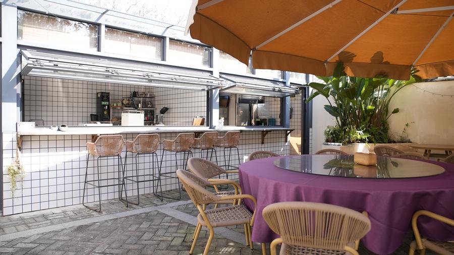 8日、民宿「南海一舎」の中庭にあるカウンターとテーブル。(瓊海=新華社記者/許雨深)