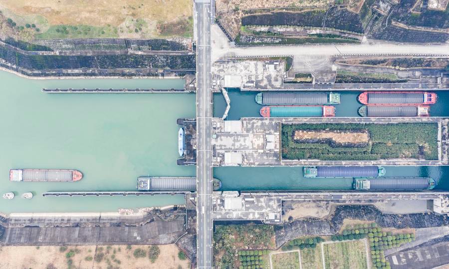 1日、三峡ダムの双方向五段式閘門を整然と通過する船舶。(ドローンから、秭帰=新華社配信/鄭家裕)