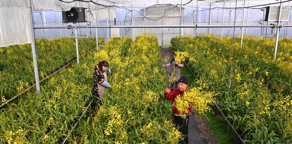 各花卉企業のハウスでは、オンシジュームやシンビジウムなどの正月用の花卉が咲き競い、作業員たちが収穫、剪定、整形、包装作業に追われ、祝日期間中の市場への安定供給を確保している。