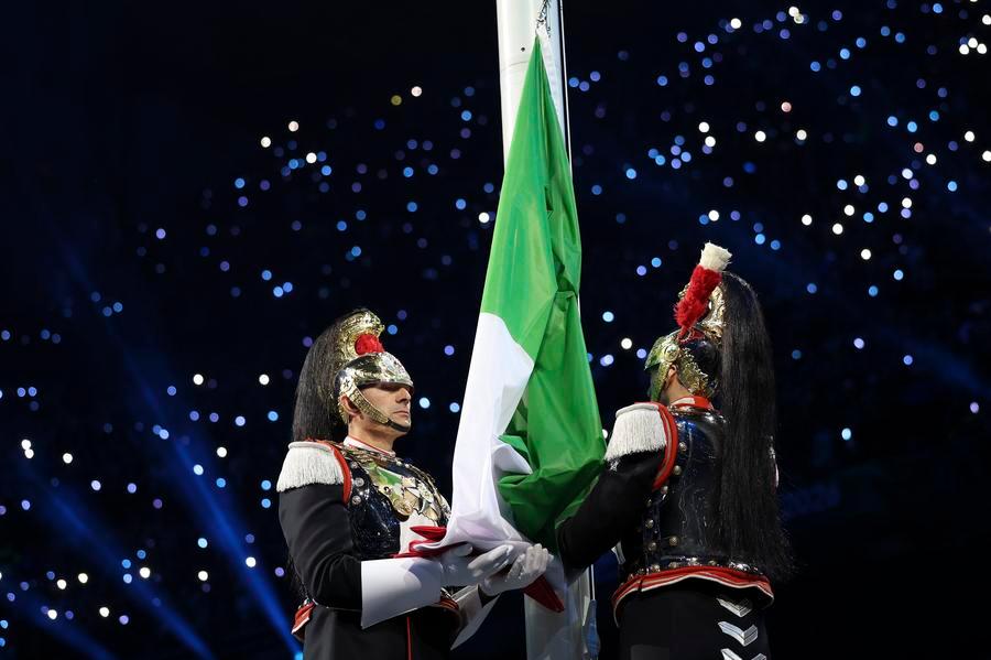6日、開会式で行われた国旗掲揚式。(ミラノ=新華社記者/李明)