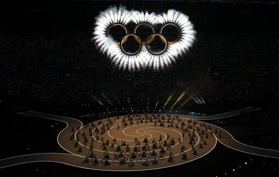 6日、開会式に登場した五輪マーク。(ミラノ=新華社記者/程敏)