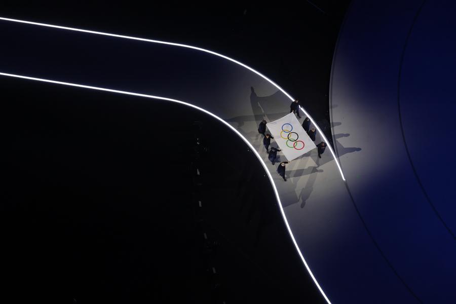 6日、開会式で入場する五輪旗。(ミラノ=新華社記者/陳益宸)