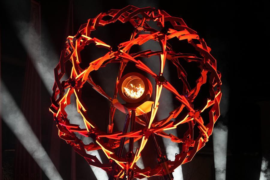 6日、コルティナダンペッツォのディボーナ広場に設置された聖火台。(コルティナダンペッツォ=新華社記者/李鋼)