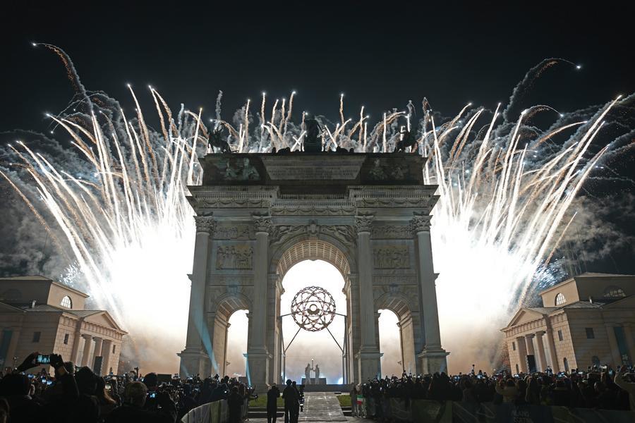 6日、ミラノの歴史建造物「平和の門」に設置された聖火台と開幕を祝い打ち上げられた花火。(ミラノ=新華社記者/孫非)