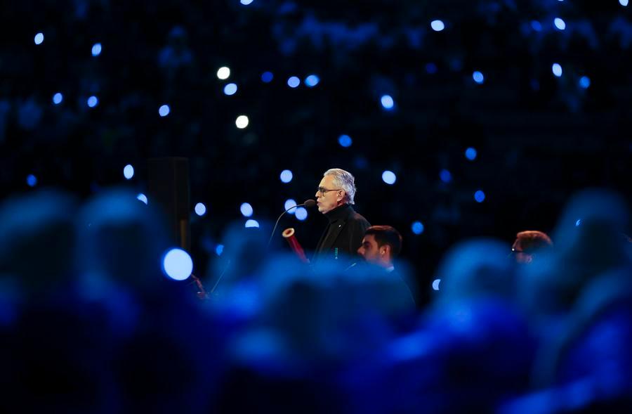 6日、開会式で歌唱を披露するイタリア人歌手のアンドレア・ボチェッリさん。(ミラノ=新華社記者/李明)