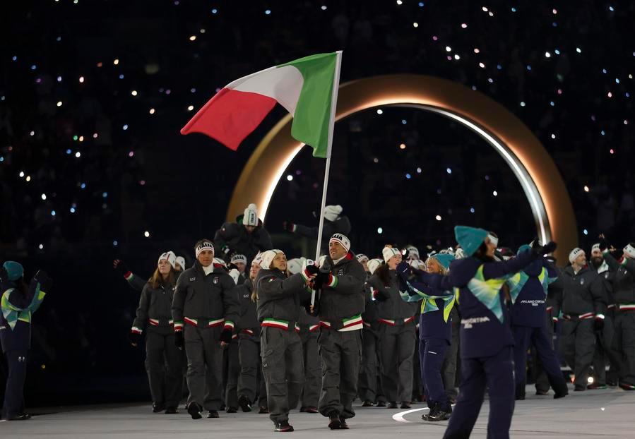 6日、開会式で入場行進するイタリア選手団。(ミラノ=新華社記者/李明)