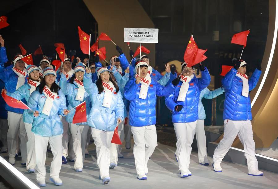 6日、開会式で入場行進する中国選手団。(ミラノ=新華社記者/張晨霖)