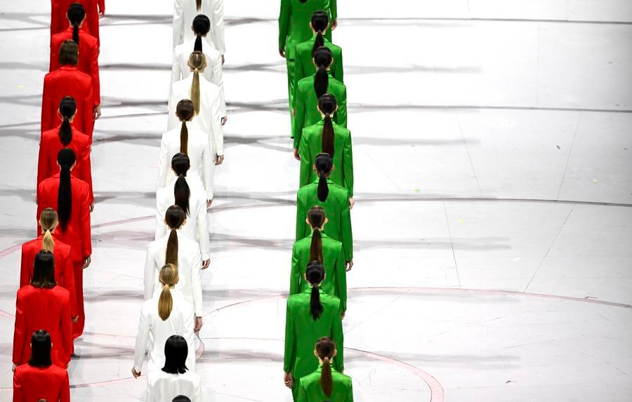 6日、開会式でイタリア国旗の色を象徴する衣装を身にまとうパフォーマンスの出演者。(ミラノ=新華社記者/張豪夫)
