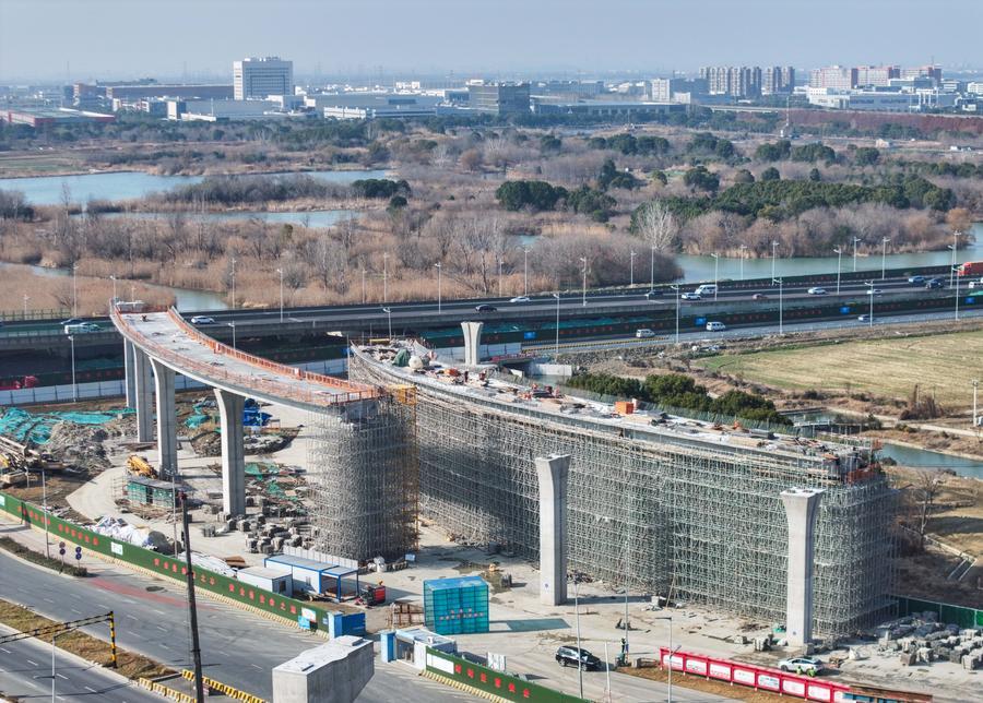 高速鉄道蘇州北駅快速連絡道路の工事現場。(ドローンから、蘇州=新華社記者/季春鵬)
