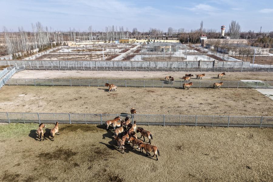 甘粛絶滅危惧動物保護センターで飼育されているモウコノウマ。(ドローンから、武威=新華社記者/郎兵兵)