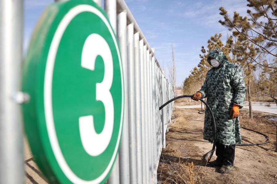 甘粛絶滅危惧動物保護センターで、柵の外からモウコノウマの飲み水を補充する職員。(武威=新華社記者/陳斌)