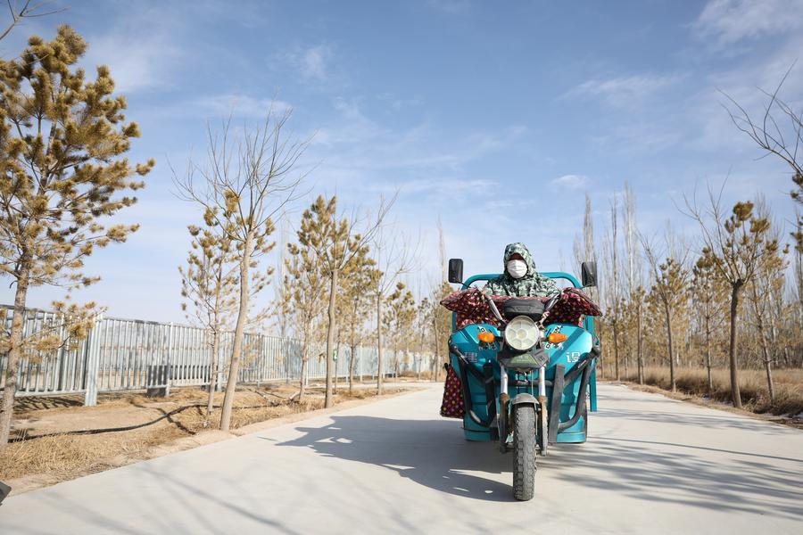 三輪バイクでモウコノウマの飼料を運ぶ甘粛絶滅危惧動物保護センターの職員。(武威=新華社記者/陳斌)